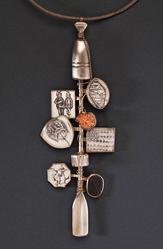 Cape Cod Remembered, 2000 Neckpiece Fine and sterling silver, pencil drawings on paper under watch crystals, stone and shell from Cape Cod 13" x 5½" x ½